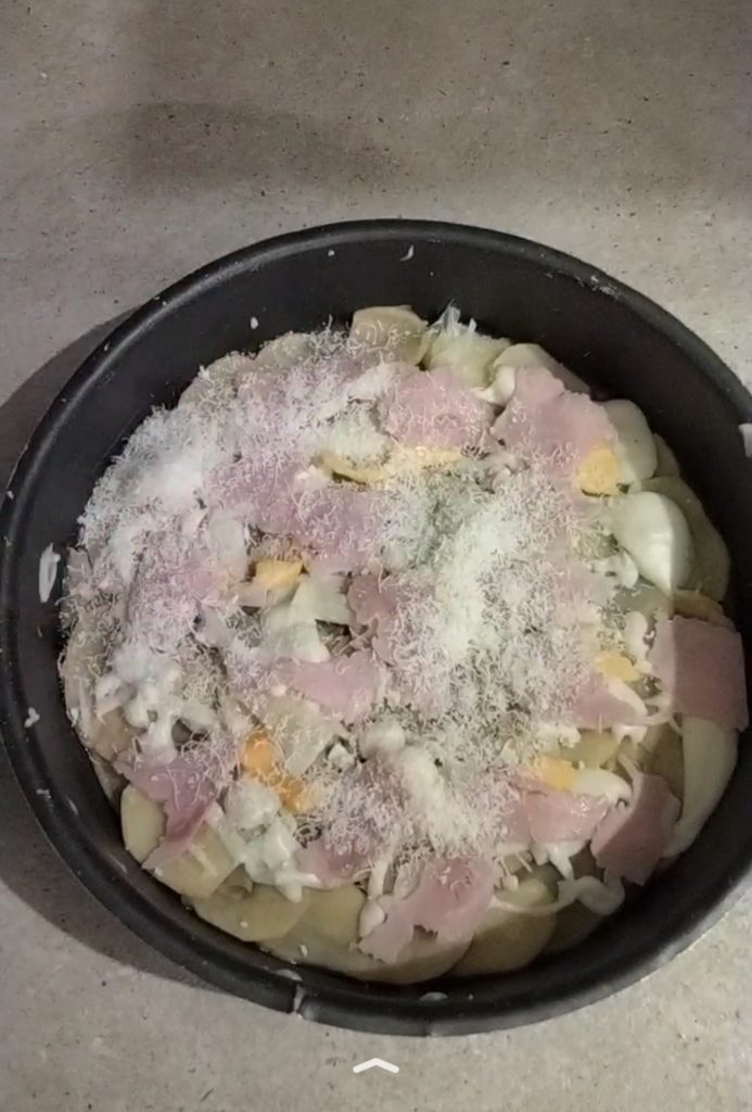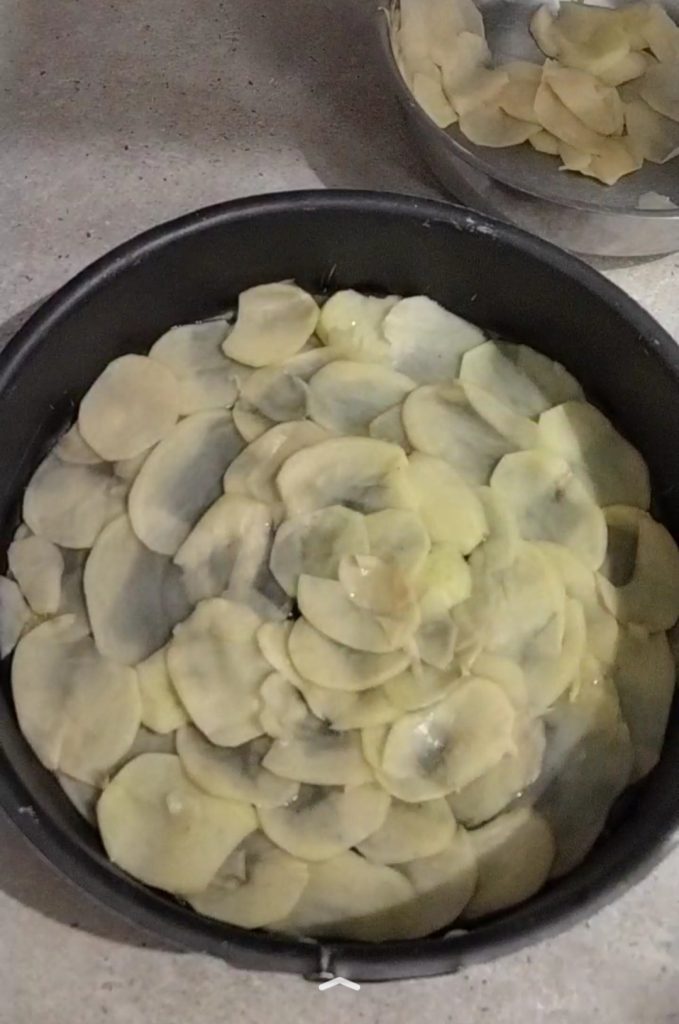 Grease a 10.25 inch (26 cm) diameter pan with a bit of olive oil, then layer the potato slices.