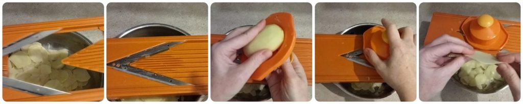 Start by washing, peeling the potatoes, and slicing them very thinly. I used a tool I found in my mom’s storage room, but I saw that they still sell it!