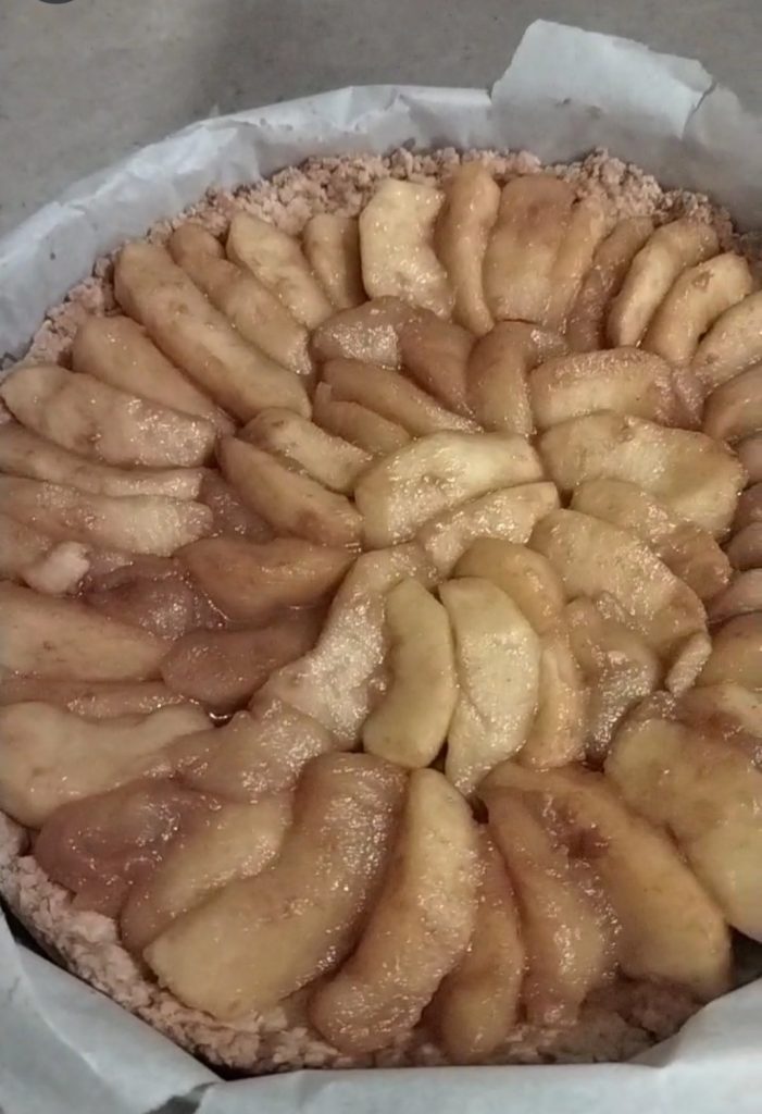 I placed the apple slices in a pan and added about 5 oz (about 3 tbsp) of caramel that I had prepared earlier and about 1/2 cup of water. If you don’t have ready-made caramel, put the butter in the pan, add the sugar and let everything melt.