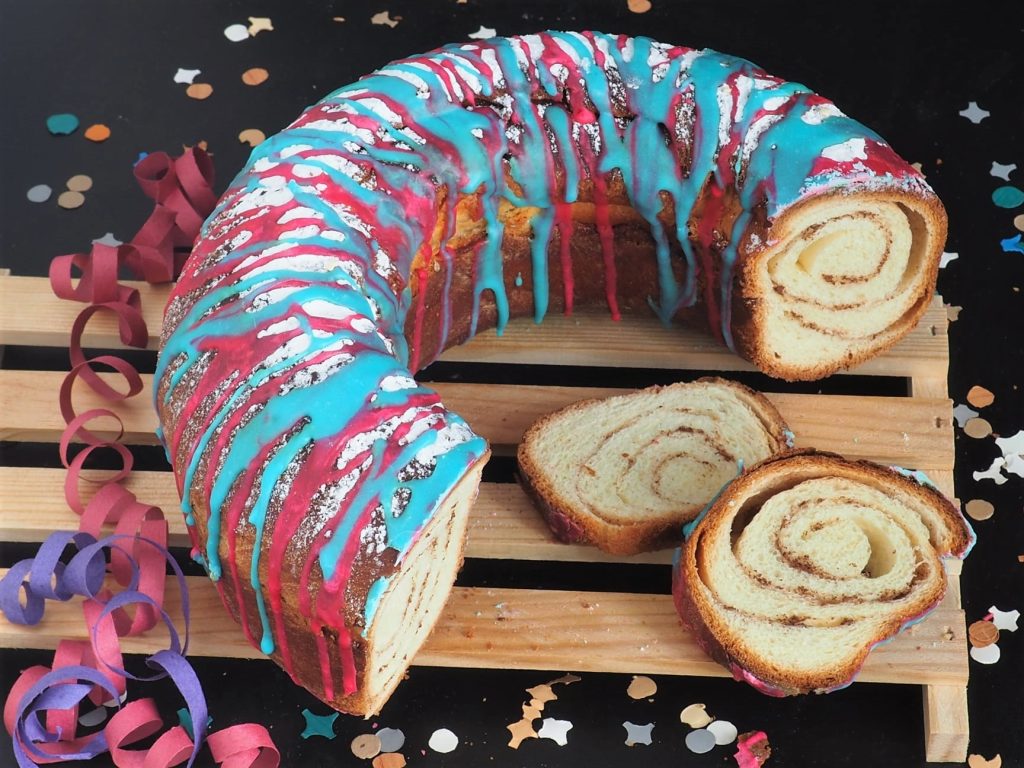 The Carnival Cinnamon Donut is a delicious and fragrant dessert, made cheerful and colorful by pink and blue glaze. If you like, you can also fill it with a bit of jam, choosing your favorite flavor.
