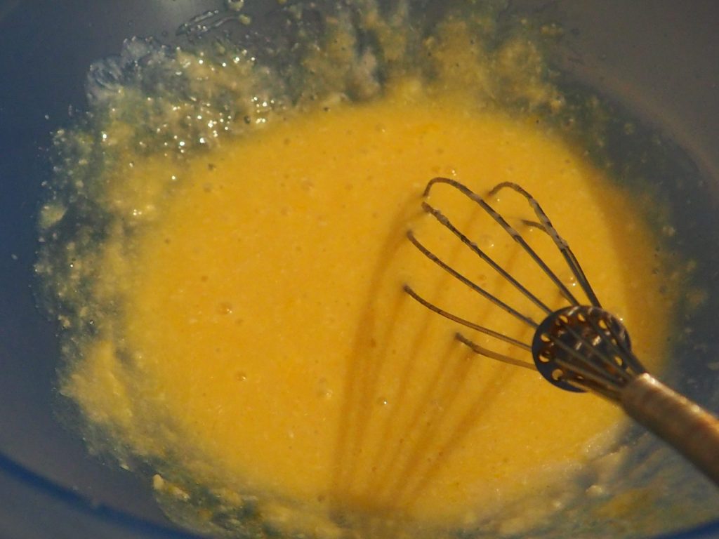 In a bowl, place the milk with the activated yeast, sugar, melted butter, eggs, salt, and whisk the ingredients together.