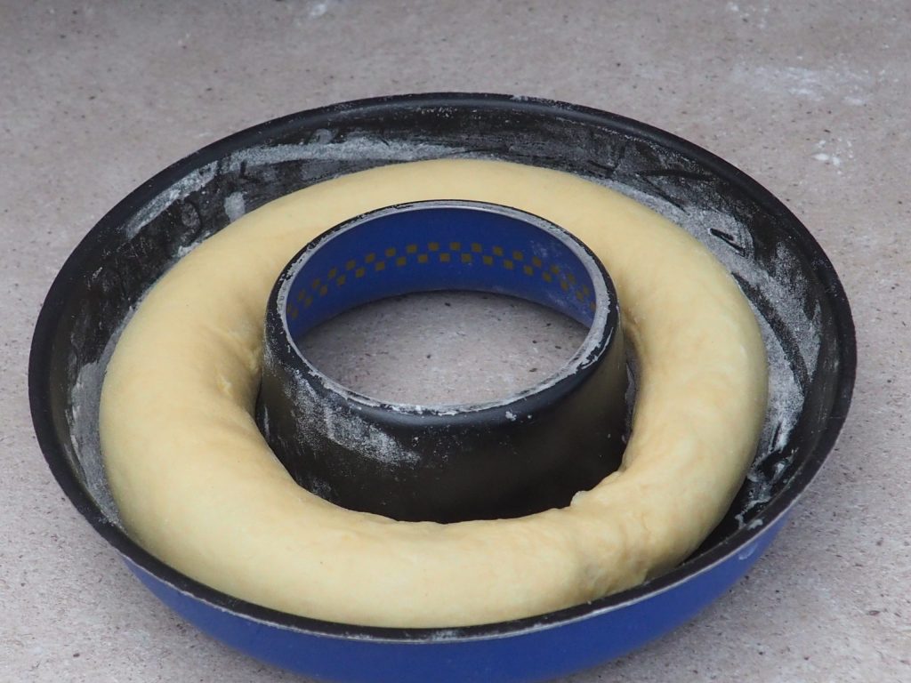 Butter and flour a donut pan with a diameter of about 9 1/2 to 10 inches and place the roll inside. Brush the surface with a bit of melted butter and sprinkle with sugar. Bake at 350°F for about 40 minutes. If the surface browns too much, cover it with foil.