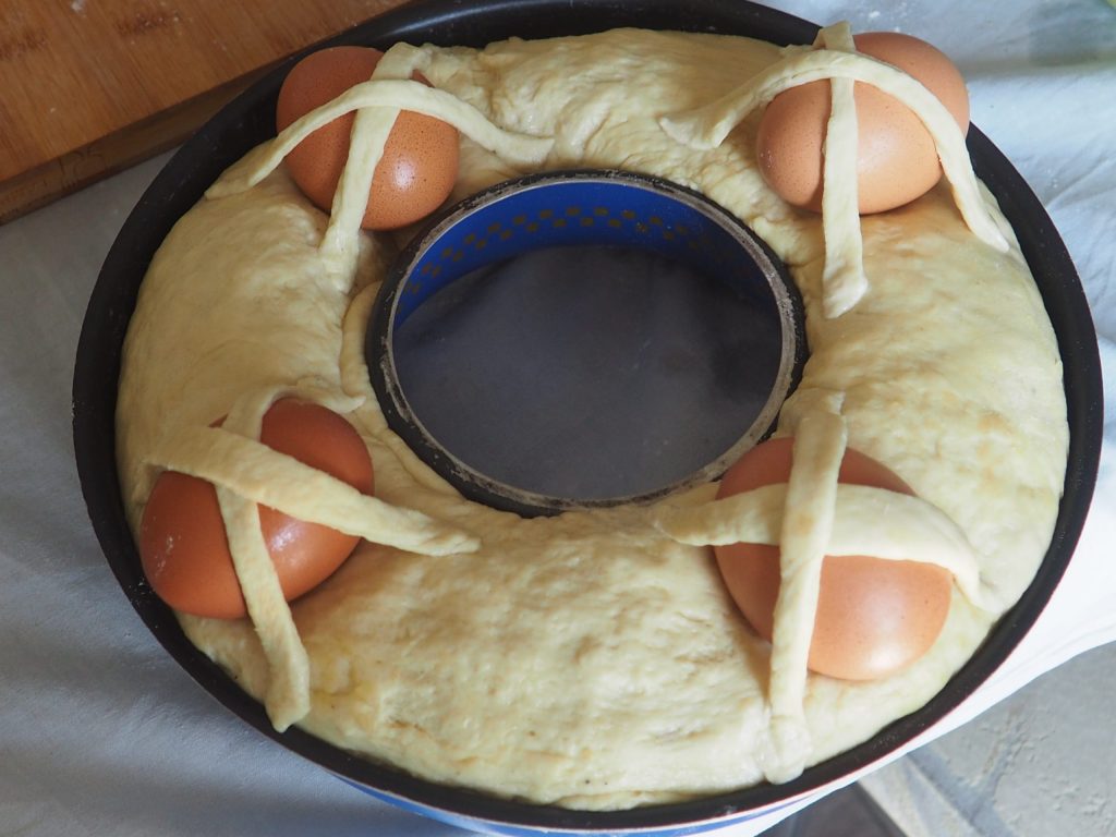 Wash the 4 eggs thoroughly and place them on top of the casatiello.