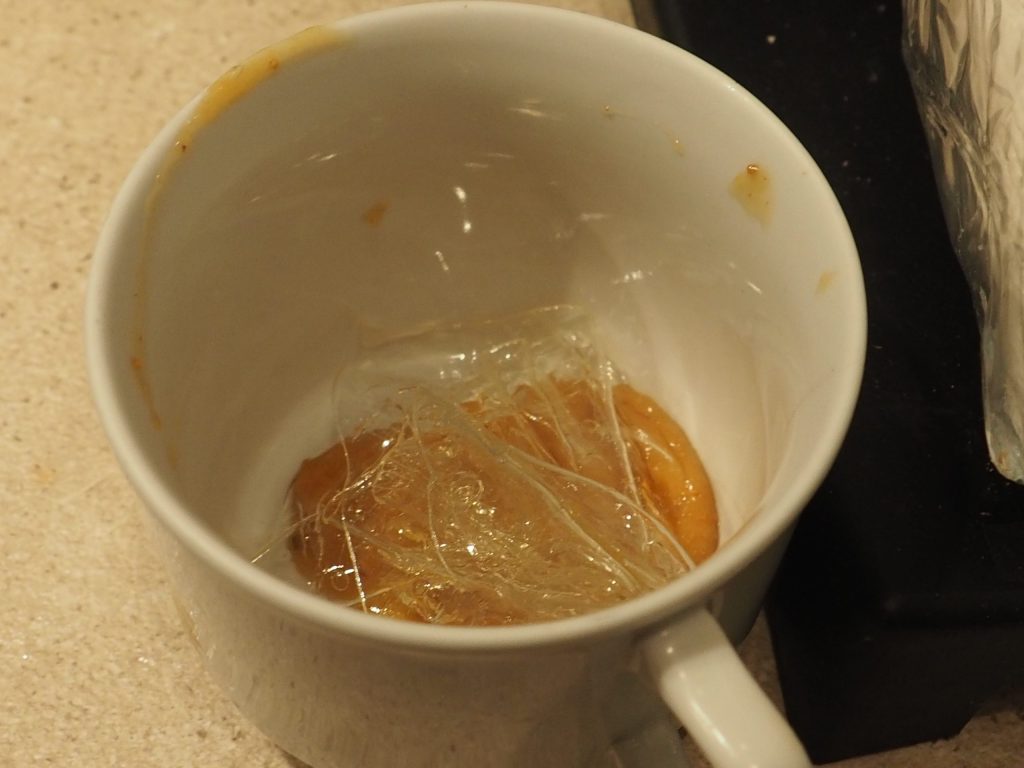 Once the gelatin has softened, put two tablespoons of milk in a bowl, add the squeezed gelatin sheets and heat in the microwave for a few seconds.
