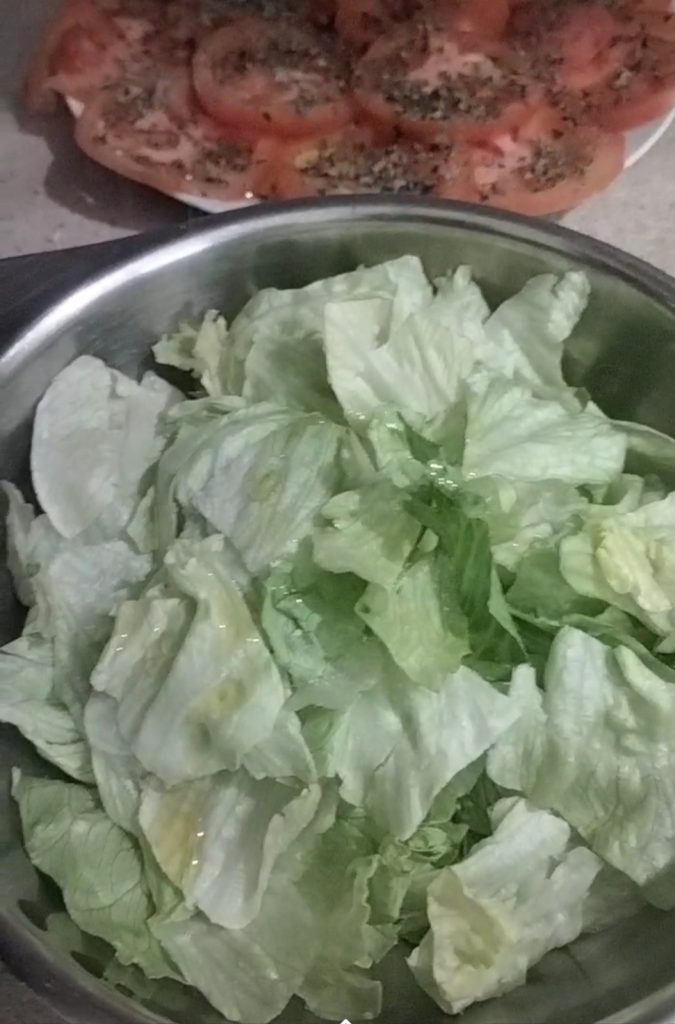 Wash and break the lettuce into pieces. Season it with oil and fine salt.