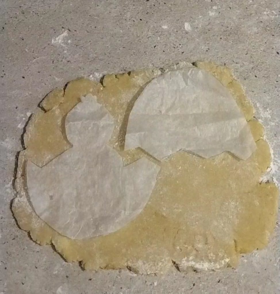 Divide the shortcrust pastry into two parts, roll it to about 1/4 inch in height. Place the paper molds on top and cut the outlines with a sharp knife.