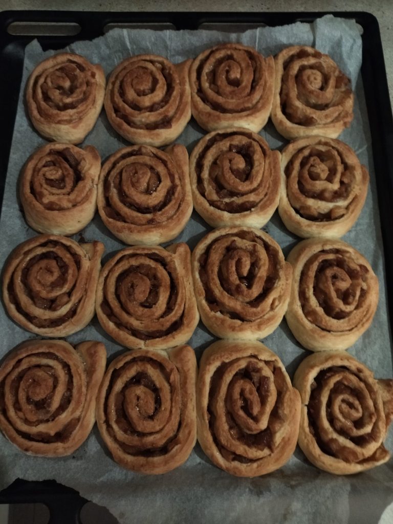 Who loves cinnamon as much as I do, raise your hand! These Cinnamon Rolls are a delight, I wanted to enrich them with a delicious filling of cooked apples, in addition to a great cream made with butter, sugar, and cinnamon. They didn’t even last a day, we gobbled them all up in no time!