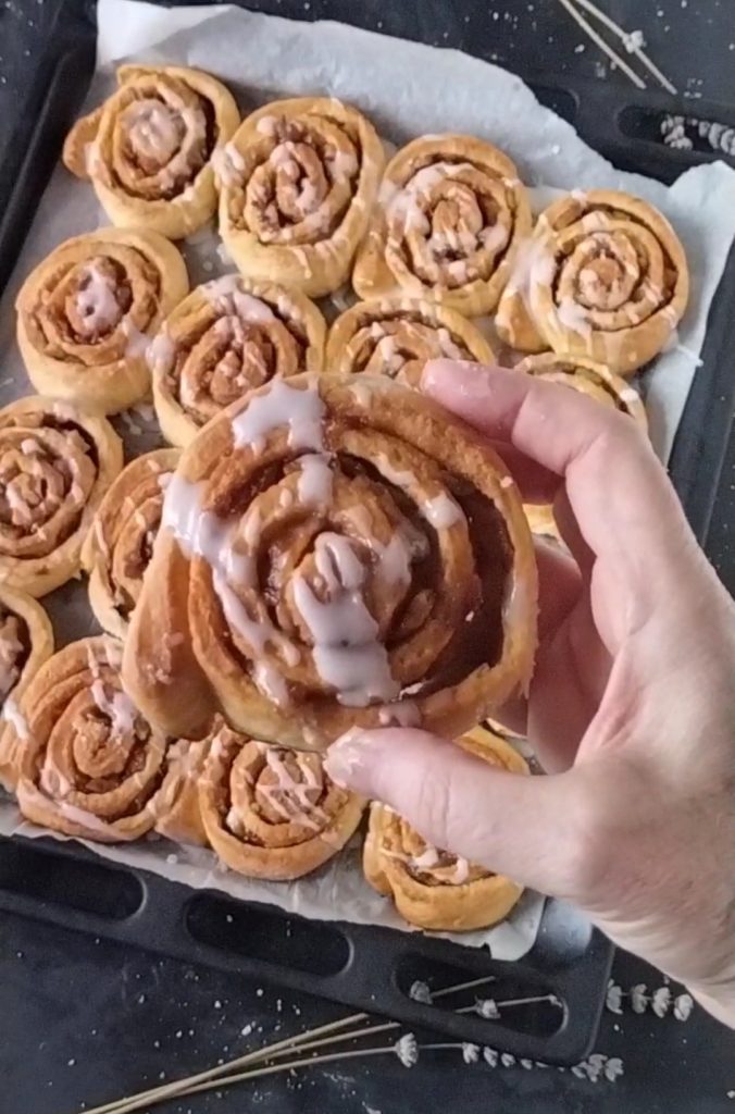 Typically, the cream used to decorate Cinnamon Rolls is cheese-based, but we prefer lemon glaze as we find it makes them lighter and more delicate.
