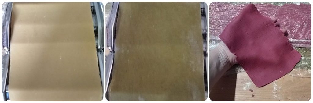 • Now roll out the dough pieces, inserting a piece of dough at the maximum thickness, fold it over itself, and pass it again always at the maximum thickness. Repeat this operation at least ten times. Now pass the obtained dough sheet through increasingly thinner settings only once until you reach the penultimate thickness. You can also use a rolling pin if you prefer. I divided each dough piece into two parts and obtained two sheets per color.
