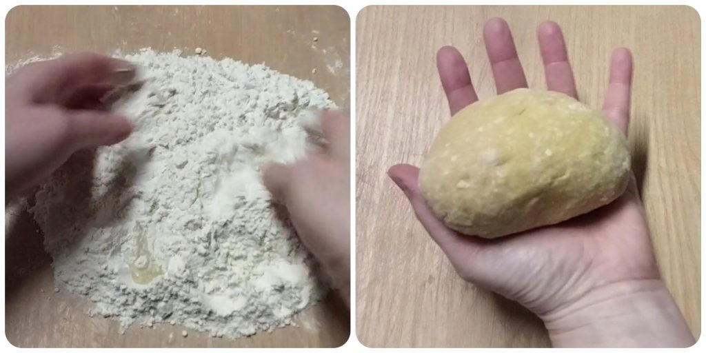 • Lastly, pour the flour into a well on a pastry board, add the eggs and knead until you obtain a smooth and homogeneous dough, easily workable. Wrap the dough in plastic wrap and let it rest for about half an hour.