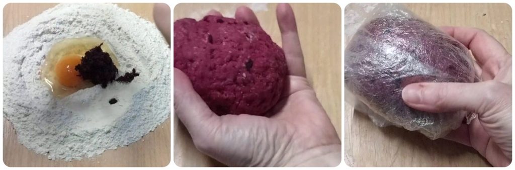 • On a pastry board, pour the flour into a well, add the egg and the red beet (previously boiled and pureed with an immersion blender). Knead until you obtain a smooth and homogeneous dough, easily workable. Wrap the dough in plastic wrap and let it rest for about half an hour.