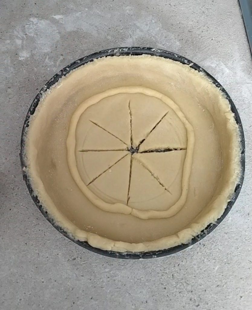 Butter and flour a 9-inch diameter pan. Remove the pastry dough from the fridge, roll it out with a rolling pin, and line the pan.