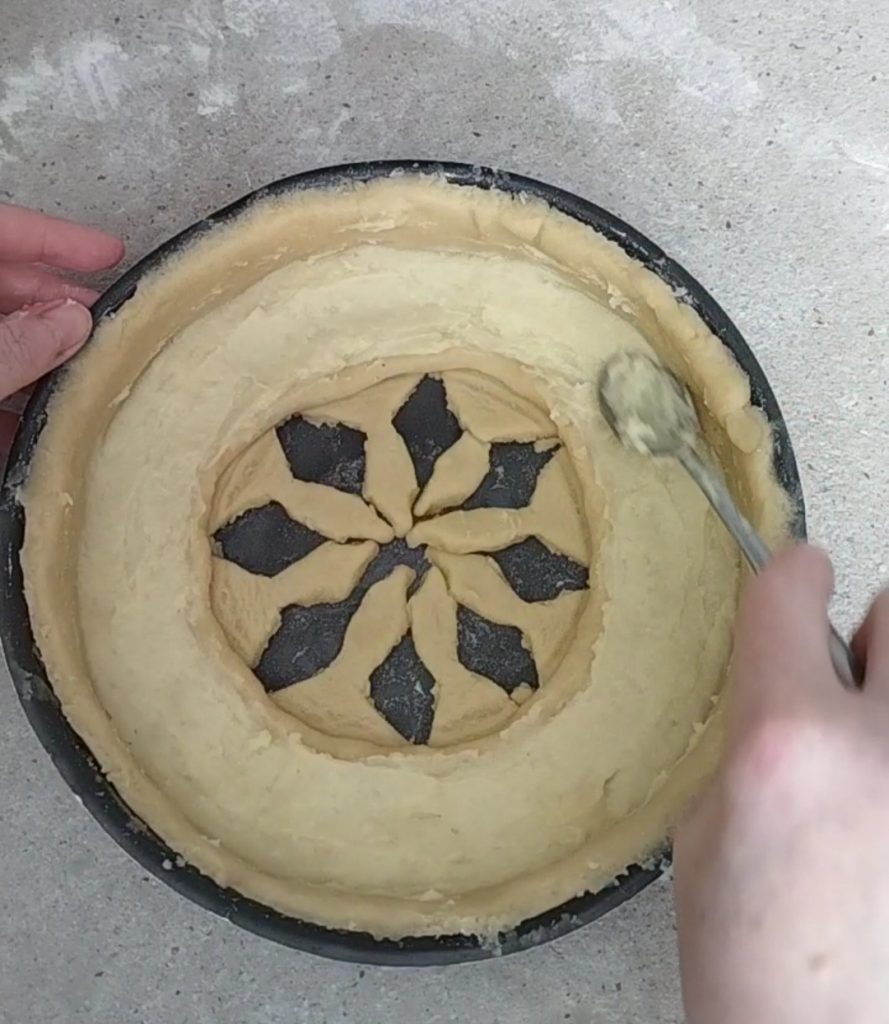 Fold the ties outward and fill the spaces with strawberries. I used frozen strawberries, which I added before baking. If you prefer, you can bake first and then place fresh strawberries on top. Trim the edges if they are too high.