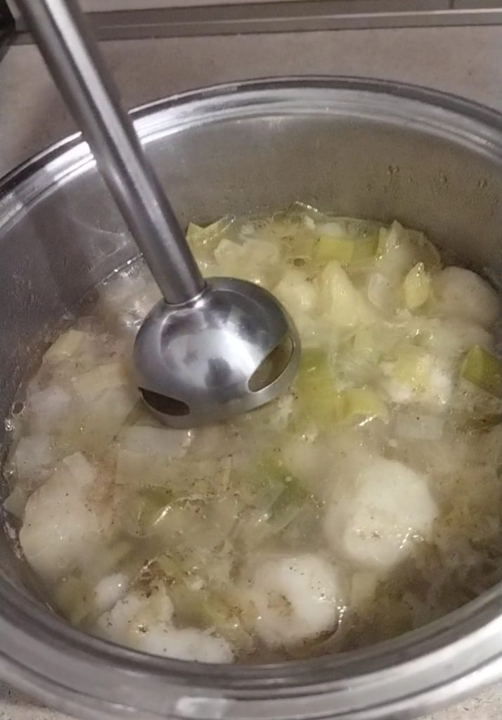 Wash and clean the Jerusalem artichokes and leek, peel the potatoes and cut them into quarters or more parts depending on their size. Now put a liter of water in a pot, add the vegetables, salt, and ground nutmeg. Cover with the lid and boil for about an hour.