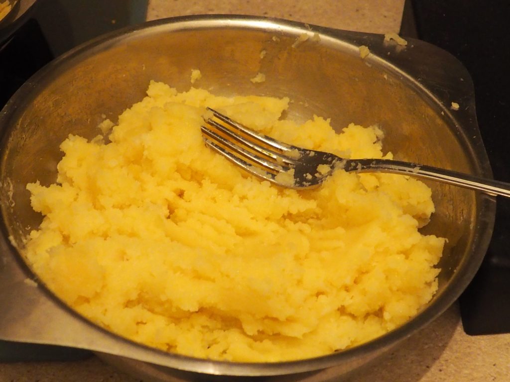 Drain the potatoes and mash them with a potato masher directly into the bowl with the butter.