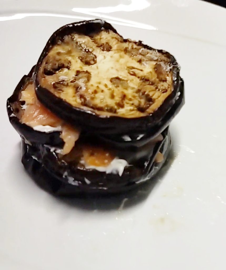 Do you like eggplants? This recipe will make you love them even more, a blend of flavors that will surprise you, simple to prepare and with very few ingredients. Eggplant Towers with cream cheese and smoked salmon for a special occasion or a gathering with friends.