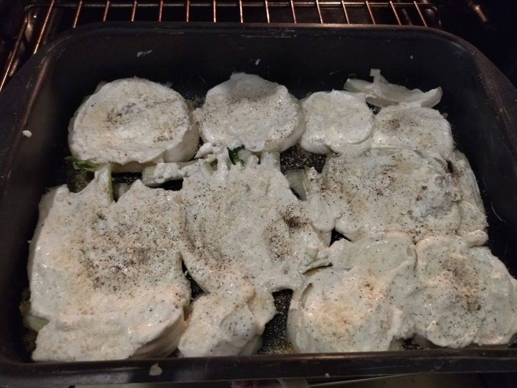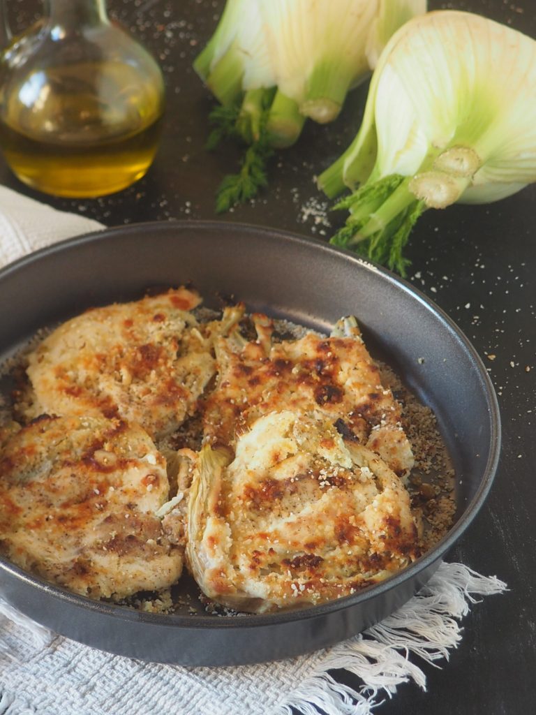 Spread the cream over the fennel slices, then top with grated Parmesan, breadcrumbs, and a sprinkle of freshly ground black pepper. Bake at 356°F for about 20 minutes, increase to 392°F for about 10 minutes, then broil at 428°F for 5 minutes, checking to make sure the fennel doesn’t burn. To ensure they are cooked, pierce them with a fork to check if they are tender.