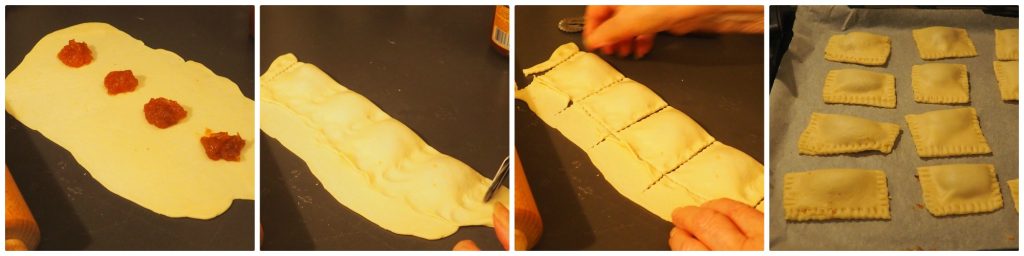 Then fold the sheet to cover the jam, press well with your fingers to seal the edges, cut with a pastry wheel, and finish with the prongs of a fork to prevent the jam from escaping.
