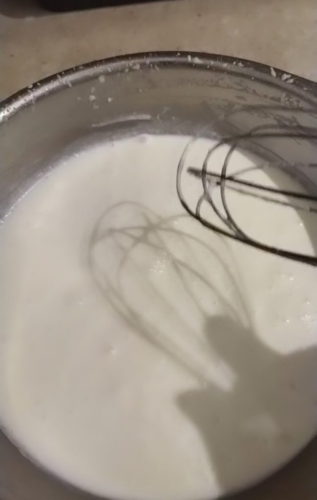 • In a bowl, pour the remaining milk, the whipping cream, the slightly cooled milk with agar agar, the cold glucose syrup, and the drops of vanillin, and mix well with a whisk to combine everything. Put the bowl in the freezer, remembering to stir it about every half hour.