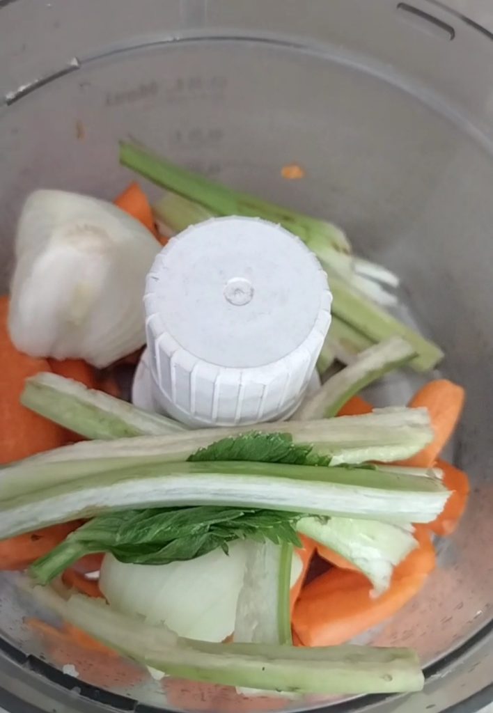 • Now wash and clean the carrots, onion, and celery. Put them in a mixer and chop them finely.