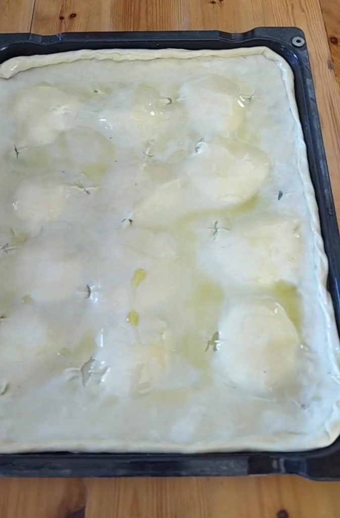 Cover with the other sheet, moisten the edges of the sheet with a little water, adhere the top one well with the bottom one and seal them by rolling them over themselves. Make equidistant holes in the top layer, so it doesn’t puff up while baking, sprinkle the surface with olive oil, distribute it on the edge as well, and add some coarse salt.