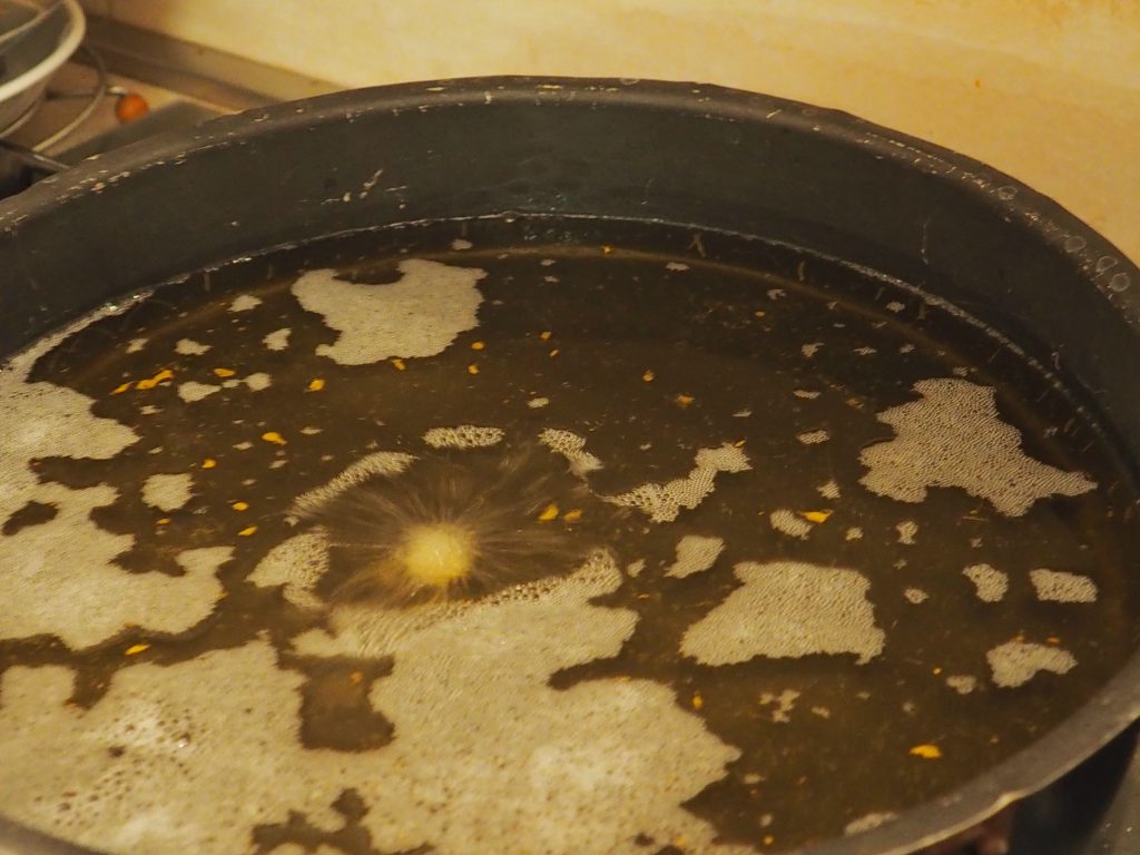 In a pan, heat plenty of vegetable oil. To check if it’s hot enough, place a small piece of dough inside, if it quickly rises to the surface, the oil is ready.
