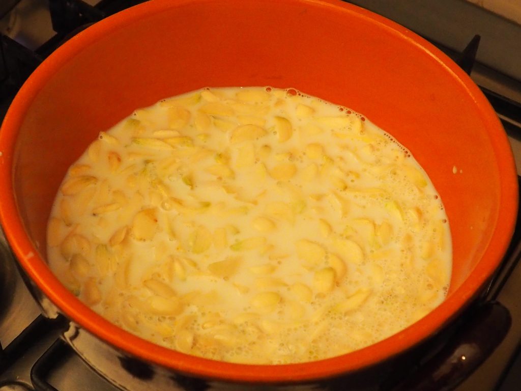 Turn the heat to medium flame, add the remaining 1 1/3 cups of milk to cover the garlic, and cook for about 20 minutes.