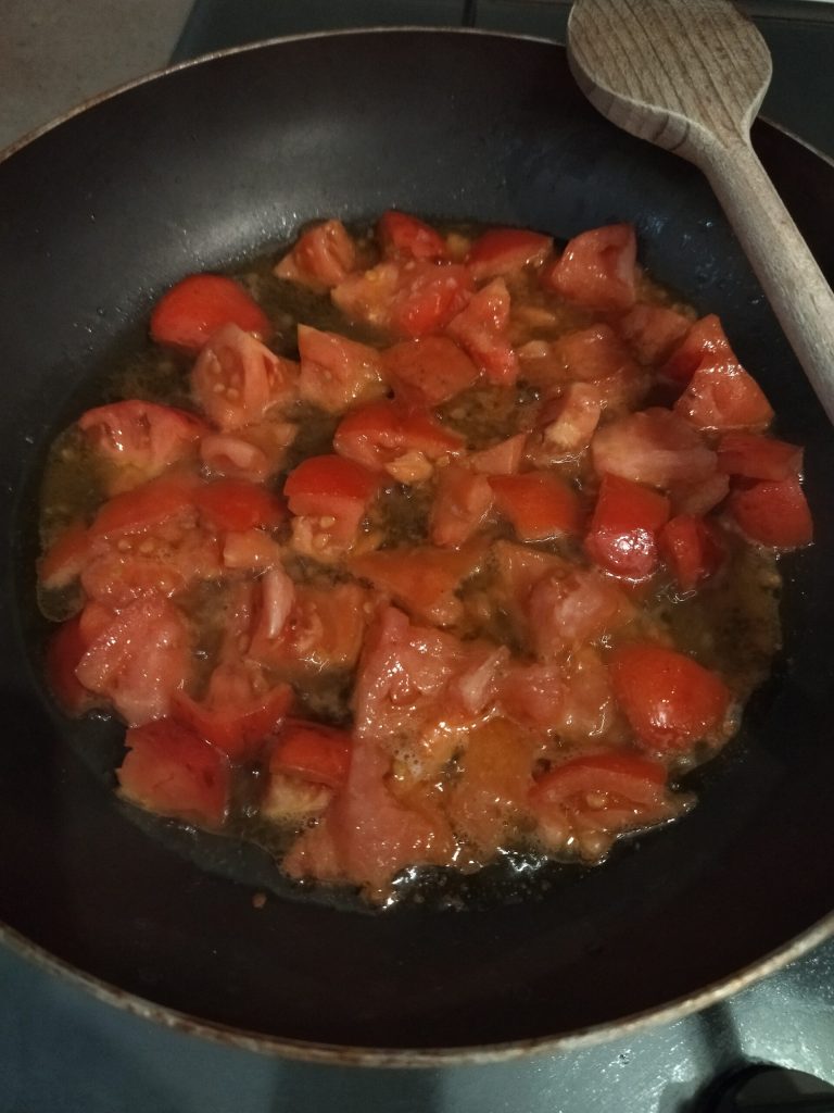 • In a pan, place the oil with the washed cherry tomatoes cut in halves or quarters (depending on size), add the salt and cook for about ten minutes over medium/low heat. In the meantime, put plenty of water to boil, add the coarse salt and pasta once it boils.