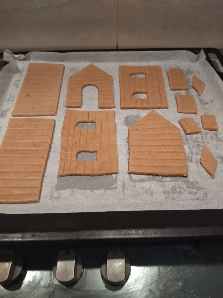 From the remaining dough, I cut out cookie shapes to place around the house as a landscape. Place the cookies on the baking sheet covered with parchment paper.