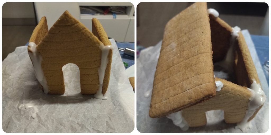 Start assembling the house by spreading the sugar glaze on the edges with your fingers or a knife. Hold for a few seconds to let it start solidifying.