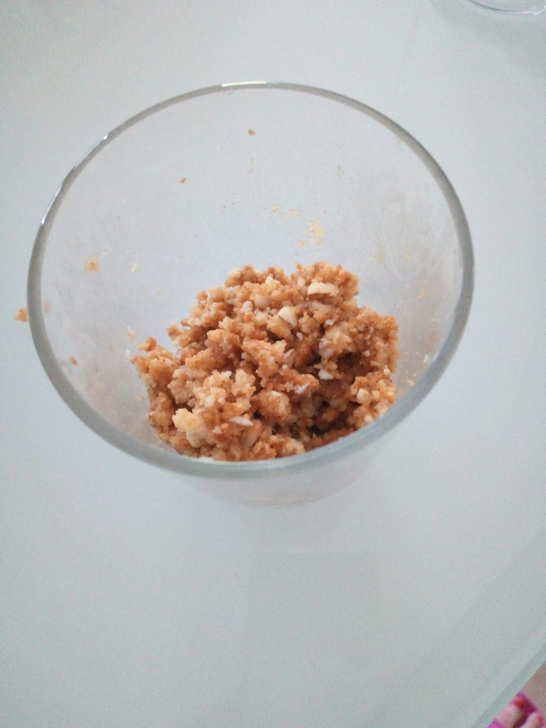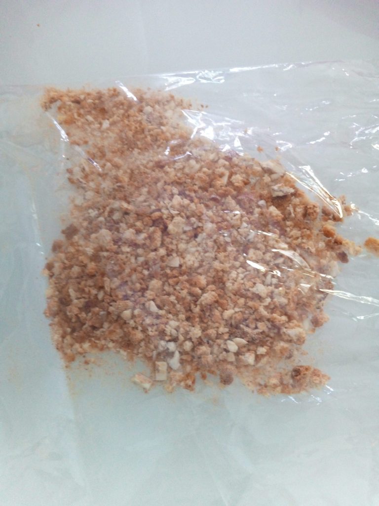 Use a glass to crush the cantucci into pieces, but not too fine, slightly coarse.