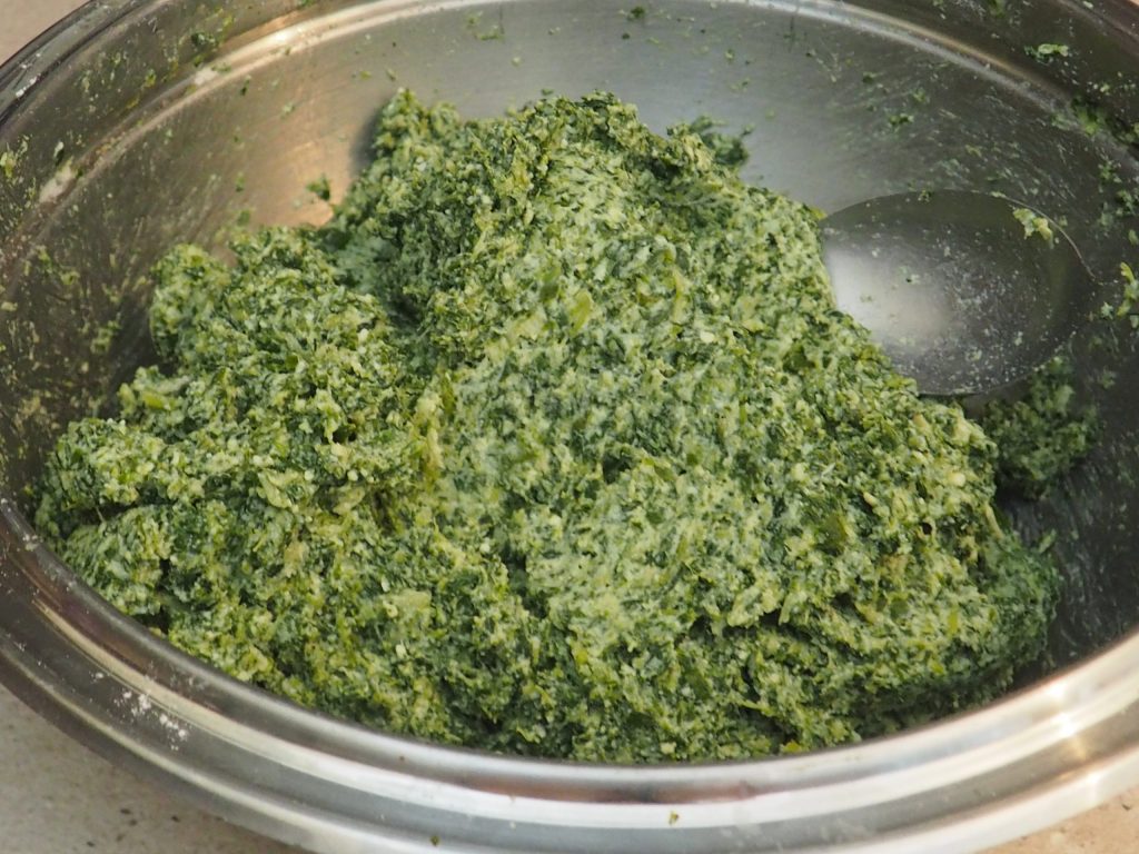 • Squeeze the boiled spinach very well (I often use frozen ones, which I prepare in summer when they are in season), chop them finely with a knife and put them in a bowl.