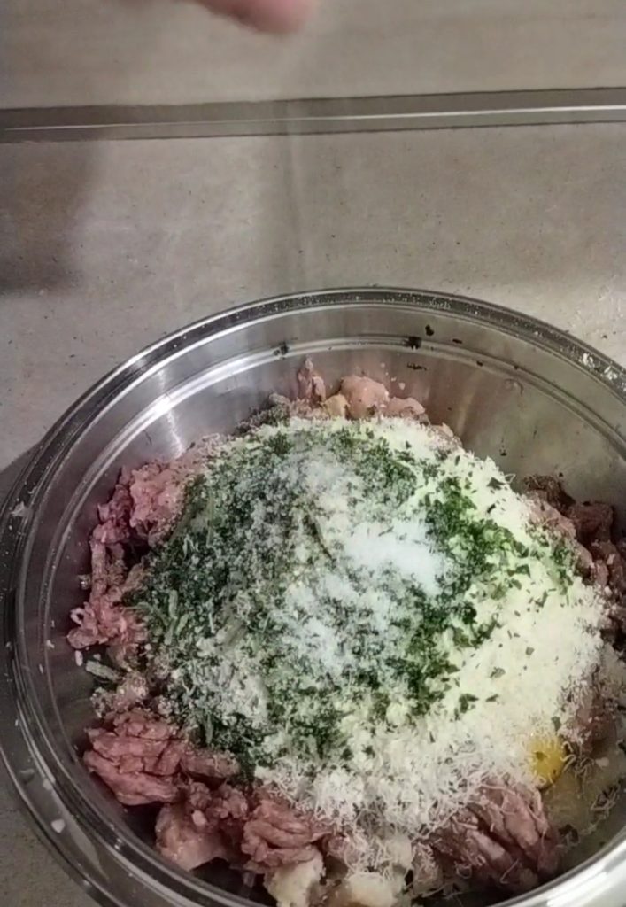 Add the Parmesan, parsley, salt, garlic powder (or, if you prefer, a finely chopped garlic clove). Mix the ingredients well, using your hands or with the help of a spatula or spoon.