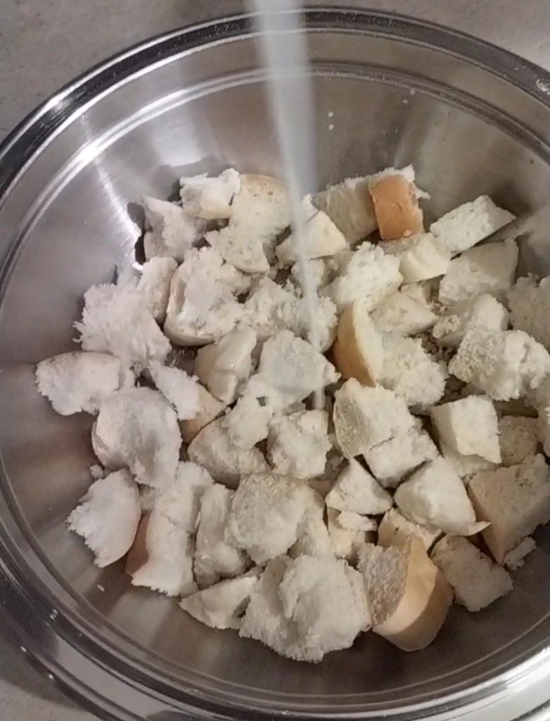 Cut the bread into fairly small squares, place it in a bowl, add the milk, and let it soak for about twenty minutes. It should be quite soft; if some pieces remain a bit hard, try to mash them with your fingers.