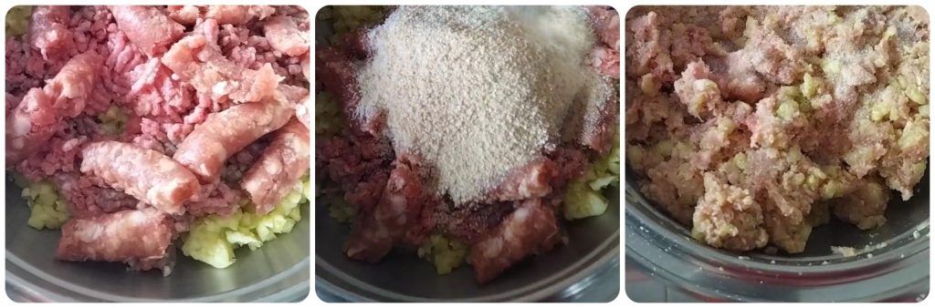 Add the sausage after removing the skin, the minced meat, Parmesan, breadcrumbs, salt, chopped parsley, garlic powder and mix well. The mixture should be compact but soft.