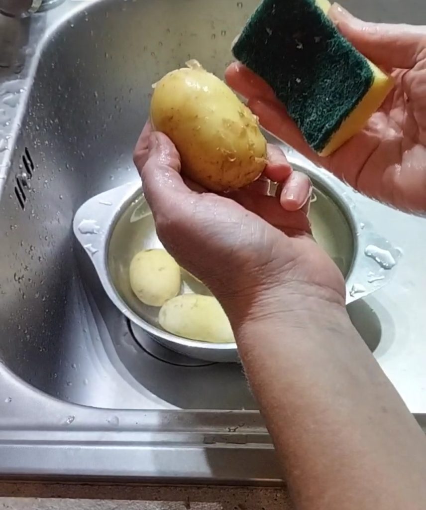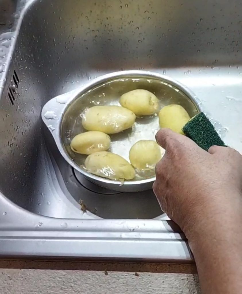 New potatoes are crispy and flavorful; I love them fried. But now let’s take a look at how we can clean them. Rinse them under running water, then with a sponge that has a rough part, scrub the surface of the potatoes; you will see that the skin comes off very easily.