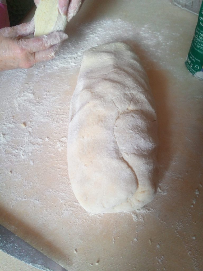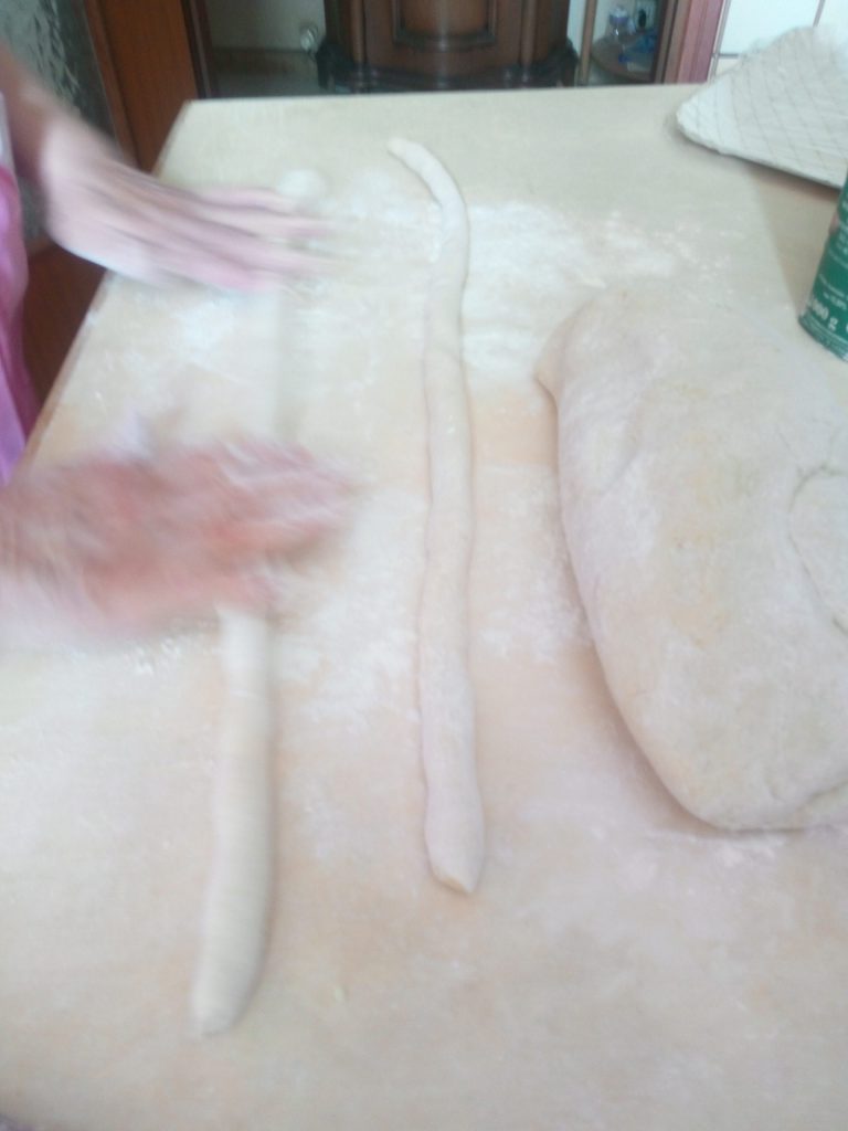 Flour the surface and lengthen the strip of dough with your fingers, forming a snake with a diameter of about 0.8 inches.