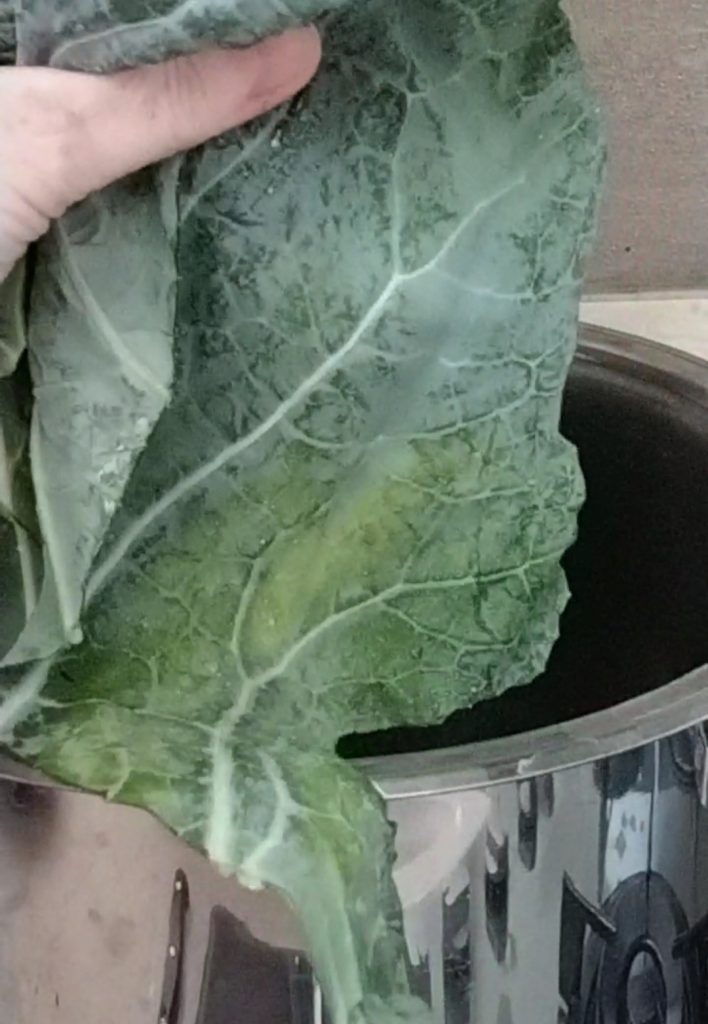 In a large pot, put a bit of water, once it boils add the coarse salt and the kale leaves.