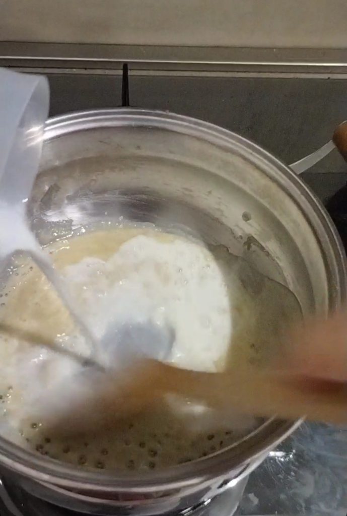 Pour in the milk, stir and adjust the salt. You can use a whisk if you prefer.