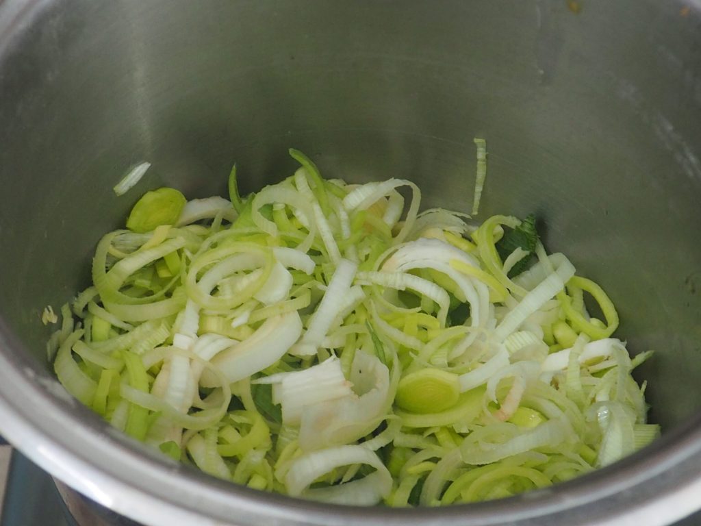 Put a little oil in a pot, add the leeks, and cook them on low heat for a few minutes.