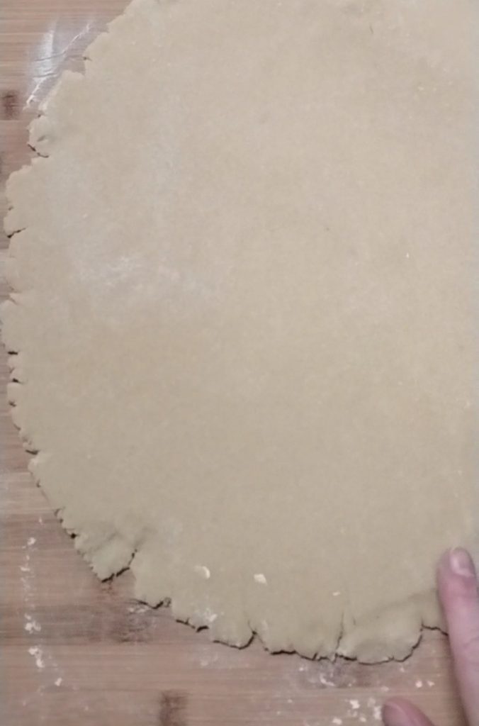 Remove the shortcrust pastry from the fridge, roll it out with a rolling pin to a thickness of about 0.2 inches.
