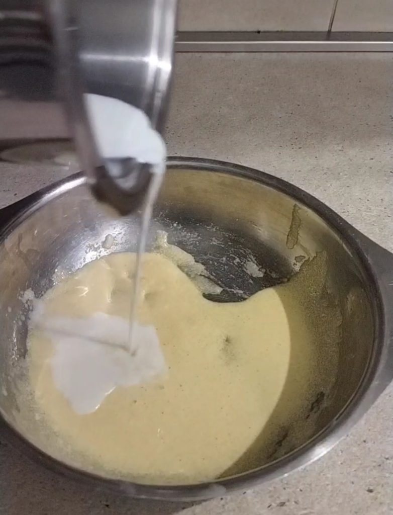Heat the milk until just before boiling and pour it over the egg mixture.