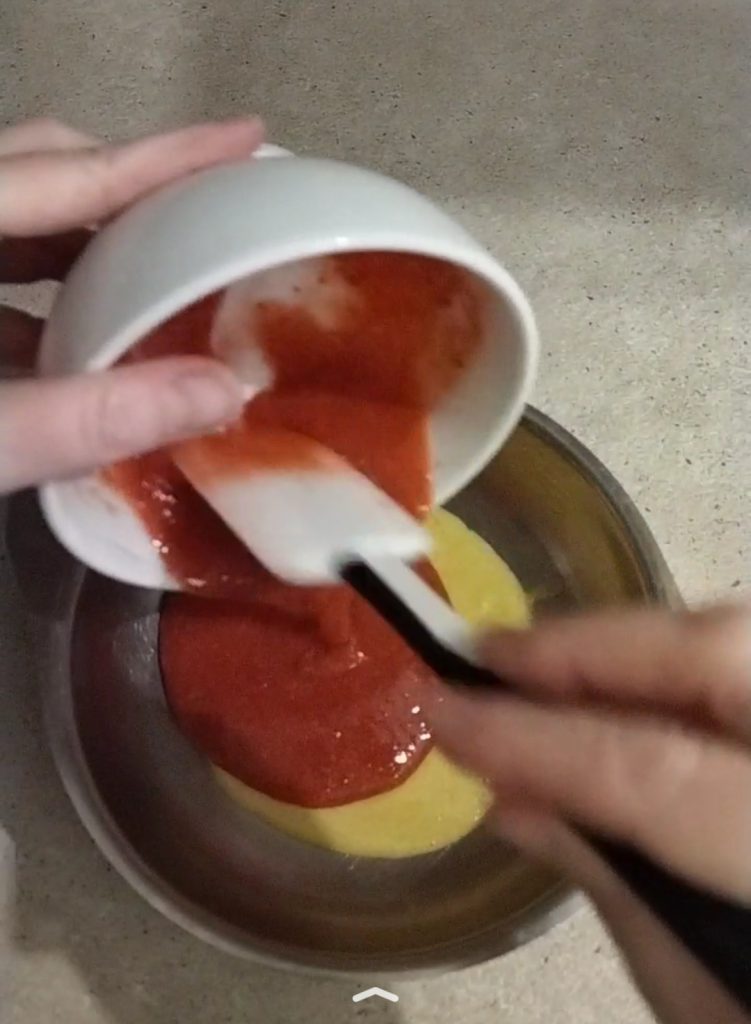 Now pour the strawberry puree into the Bavarian cream, mix well.