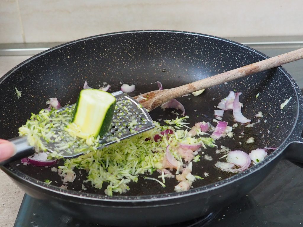 In a pan, put a little oil, the garlic, and add the grated zucchinis, carrots, onions, half a glass of water, adjust the salt, and cook for about 15 minutes.