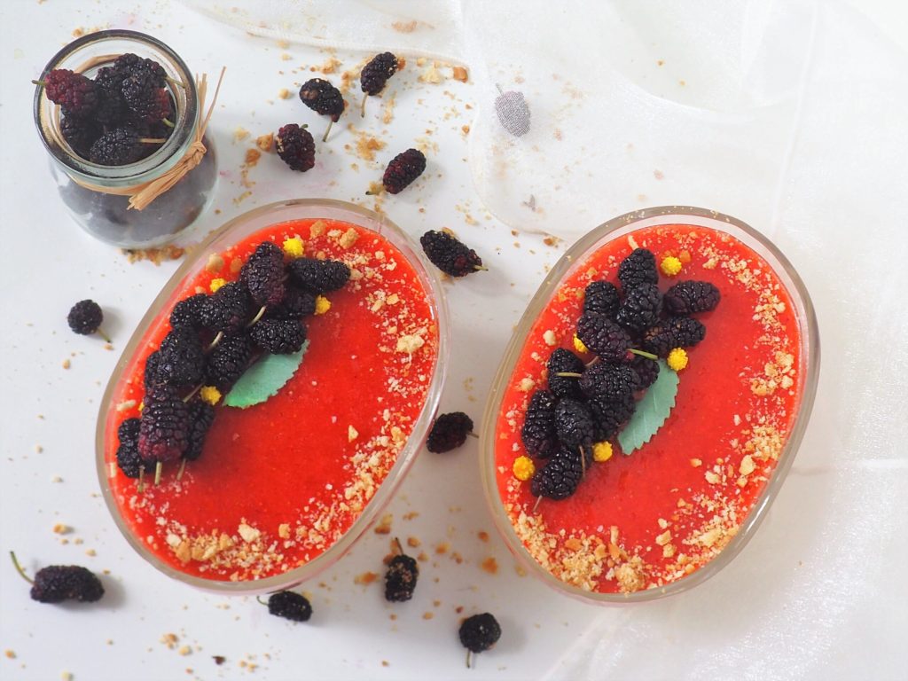 • The remaining 200g of frozen strawberries (still mixed with sugar and lemon) will be used for the topping. Blend them again with the immersion blender, heat two or three tablespoons in the microwave and add 4g of gelatin previously soaked and strained. Mix the strawberry puree with the rest of the blended strawberries and pour over the four cups in equal parts. Put everything in the fridge for a few hours. Garnish with mulberries, crushed biscuits, edible leaves, and mimosa-shaped sprinkles.