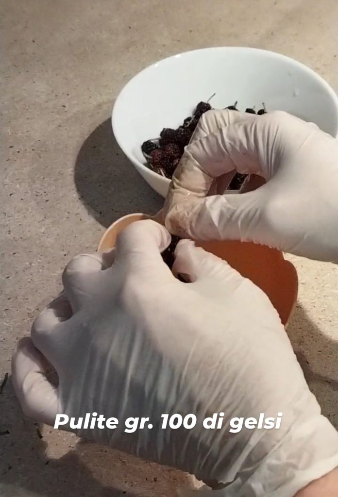 • Wash the mulberries under running water and then let them dry on a kitchen towel. To clean them, remove the stem, almost stripping the fruit’s flesh. I recommend using gloves, otherwise your hands will get stained purple.