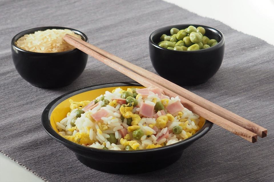 Mix the drained rice with the scrambled eggs, peas, and cooked ham.