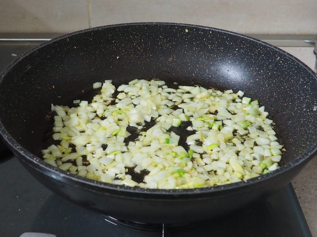 Clean the onion and chop it finely. Sauté it in a large pan with a bit of oil.
