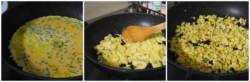 In a pan, add a bit of oil, when it’s hot, pour the egg mixture and stir, as if you were making scrambled eggs, breaking them up well.