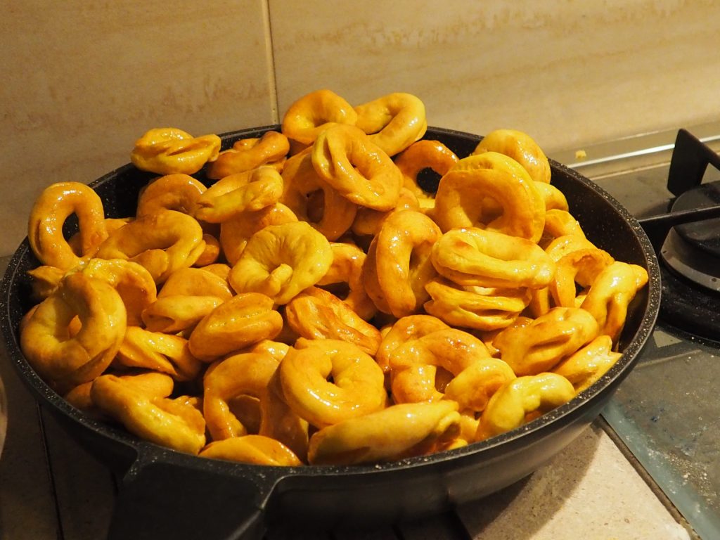 • Boil until the sugar is completely dissolved (one or two minutes), place half the taralli inside the pot and toss them so they are completely coated with the dissolved sugar.